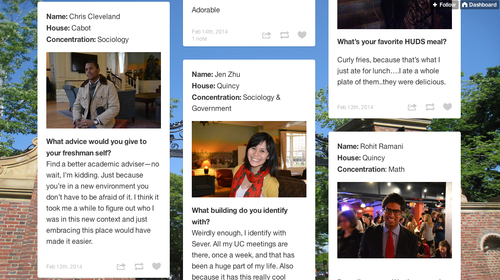 Seniors of Harvard, a blog featuring profiles of Harvard seniors shared on Facebook, combining social voyeurism with student community.