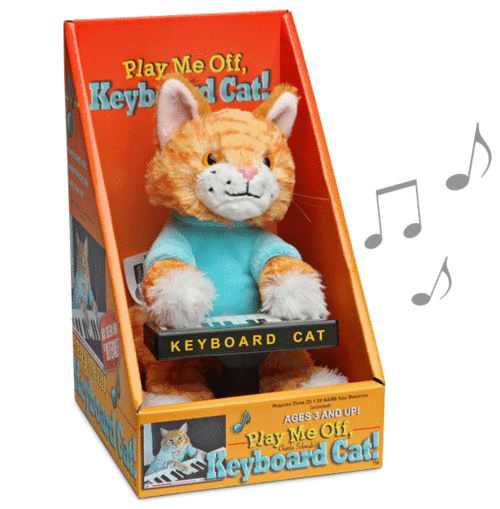 Keyboard Cat animatronic plush toy based on the viral internet video meme, sold in toy stores as both a children's toy and adult conversation piece.