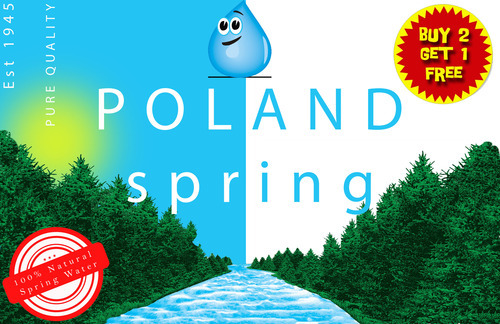 Student-designed Poland Spring affordable water label with bright colors, cartoon water droplet mascot, nature scene, and 'Buy 2 Get 1 Free' promotion.