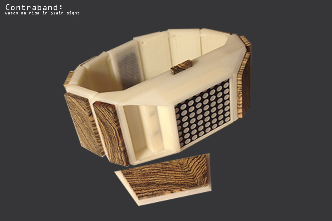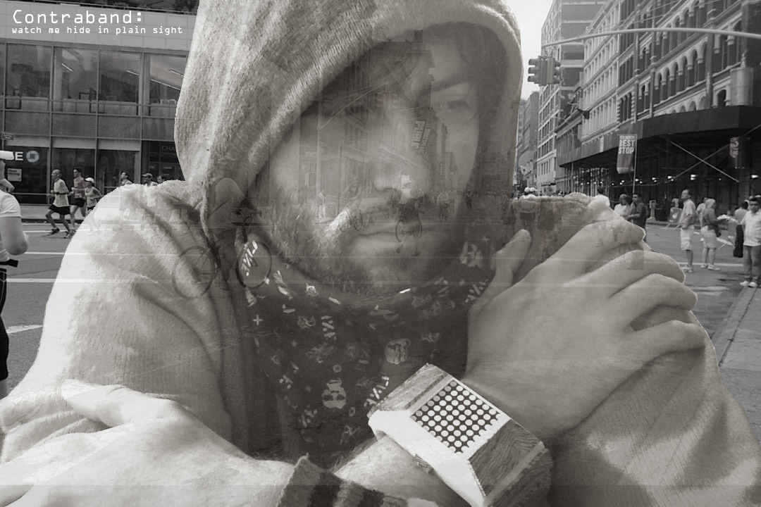 Contraband, a streetwear-styled watch concept branded as 'watch me hide in plain sight,' featuring an LED matrix face worn as an urban fashion statement.