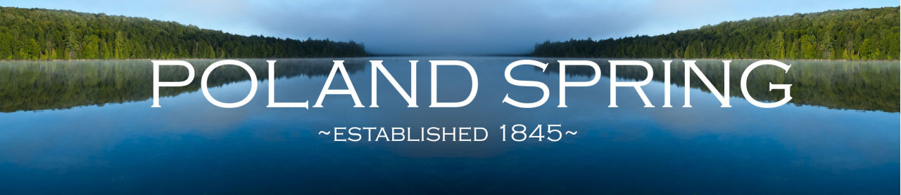 Poland Spring water brand banner featuring a serene lake landscape with the heritage tagline 'Established 1845.'