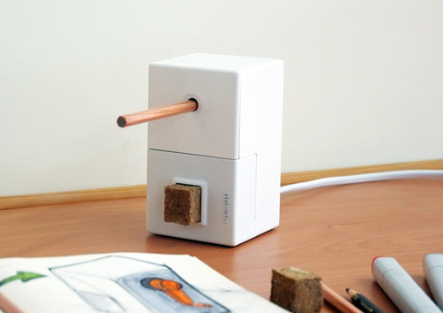 A pencil sharpener concept that compresses wood shavings into erasers, repurposing waste material from sharpening into a useful byproduct.