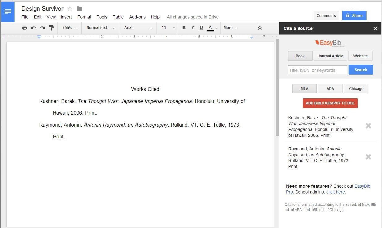 EasyBib for Google Docs: Google Docs now offers “add-ons” that allow users to customize word processing functions. EasyBib is a particularly useful add-on program that correctly formats bibliographies in several citation styles. The program is similar to online reference managers like RefWorks but is directly linked to Google Docs.