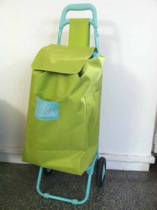 Whole Foods branded rolling shopping cart/bag in bright lime green with turquoise frame and wheels.