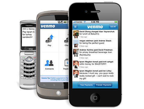 Venmo mobile payment app shown across multiple phone platforms, enabling easy peer-to-peer money transfers with social payment descriptions.