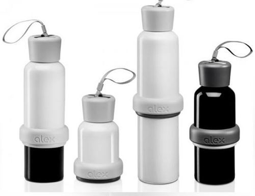 Alex Water Bottle set, a modular collection of minimalist white and black water bottles in different sizes for gym and hiking use.
