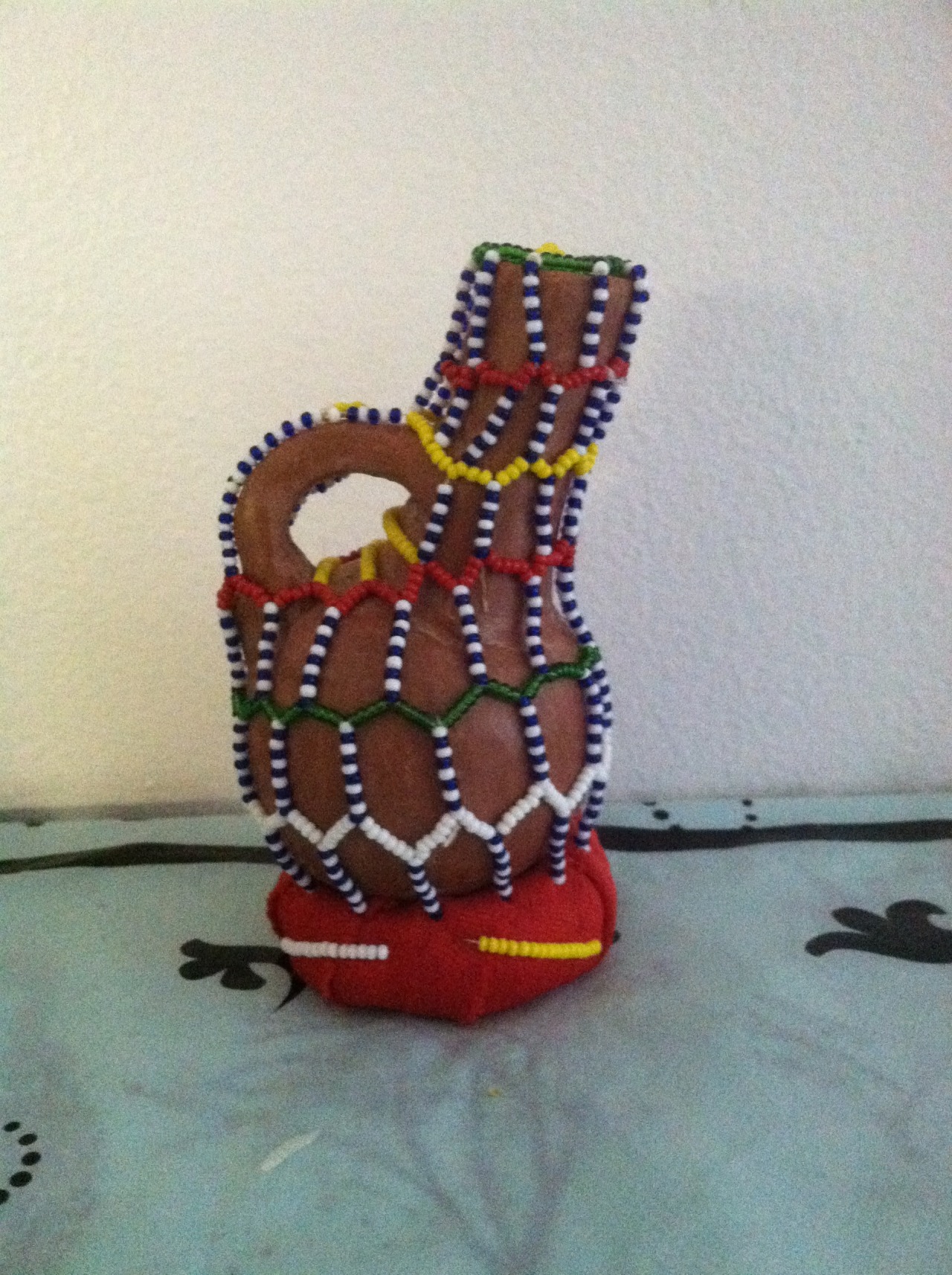 A colorful beaded vessel or vase decorated with African-style beadwork in red, blue, yellow, green, and white patterns on a terracotta-like base.