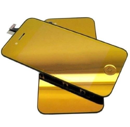 Gold-mirrored replacement iPhone screen and back panel as a flashy aftermarket upgrade to a standard iPhone.