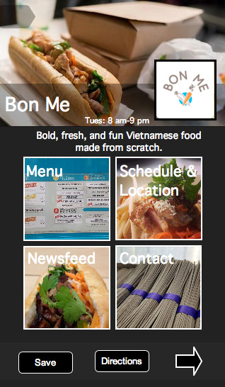 A redesigned mobile app for 'Where The Truck' food truck discovery, prototyped in Axure, featuring a Bon Me Vietnamese food truck with menu, schedule/location, newsfeed, and directions.