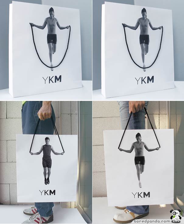 A creative shopping bag for Turkish department store YKM Sport where the bag handles become a jump rope held by a printed athlete figure, creating an interactive visual effect.