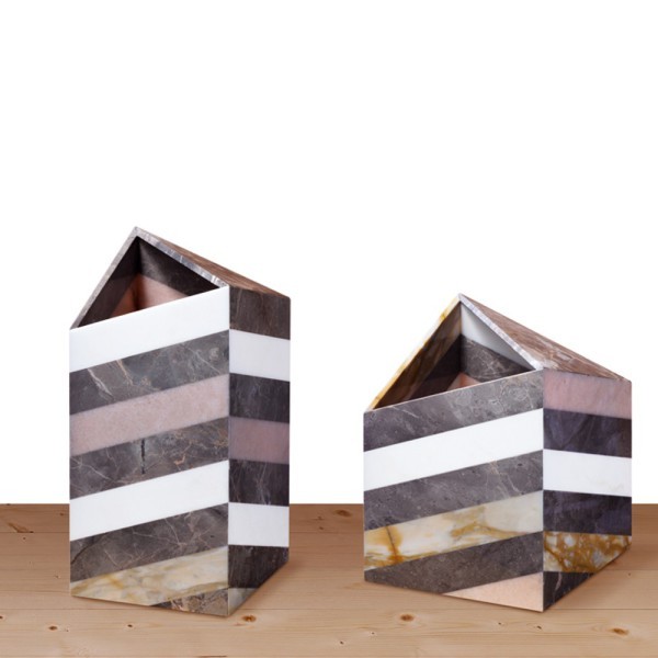 Shelving collection made from scrap pieces of marble by Patricia Urquoila for Budri drawing inspiration from japanese origami folding patterns.