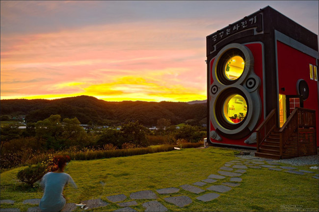 A building in South Korea designed to look like a giant twin-lens reflex camera, built as a shrine by a camera-obsessed family.