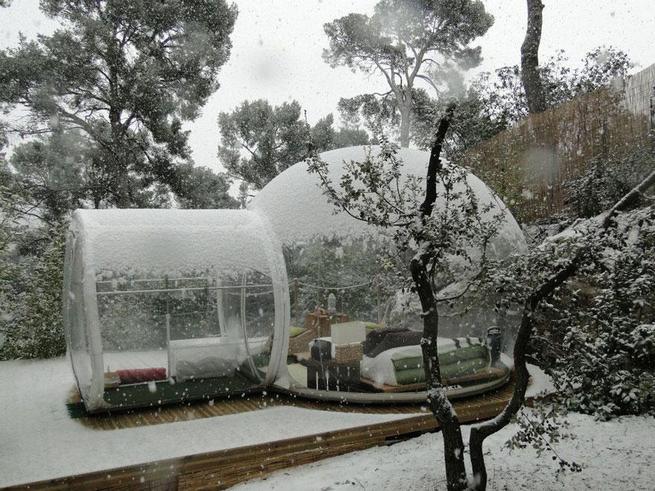 A transparent bubble-shaped hotel room that lets guests sleep outdoors in nature while staying warm and sheltered, even in winter snow.