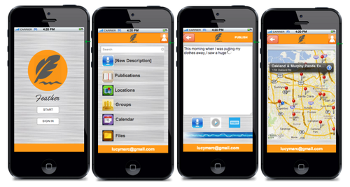 Feather, a student-designed iPhone app for easy writing via voice or text input, with publishing to groups, anonymous posting, calendar integration, and location pinning.