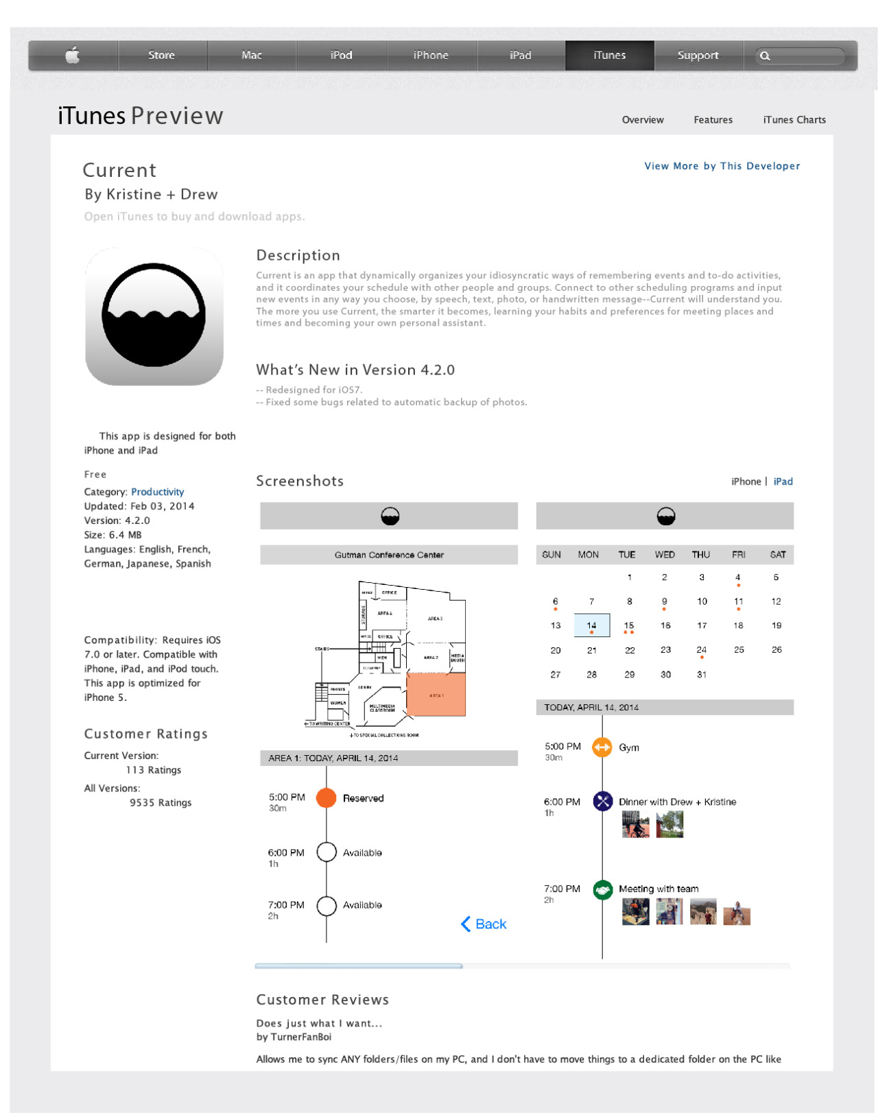 Current is an app that dynamically organizes your idiosyncratic ways of remembering events and to-do activities, and it coordinates your schedule with other people and groups. Connect to other scheduling programs and input new events in any way you choose, by speech, text, photo, or handwritten message–Current will understand you. The more you use Current, the smarter it becomes, learning your habits and preferences for meeting places and times and becoming your own personal assistant.