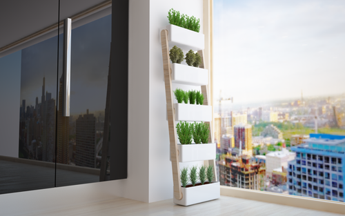 A vertically stacked indoor flower/herb planter with white tiers and wood frame, designed for space-efficient apartment gardening.