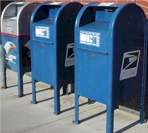 USPS blue drop boxes, public mail collection boxes found on streets across the US for posting letters and packages.
