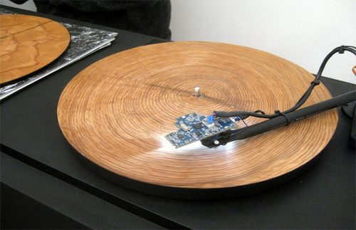 A modified record player by artist Bartholomäus Traubeck that reads cross-sections of tree trunks instead of vinyl, translating tree ring data into piano compositions via algorithm.