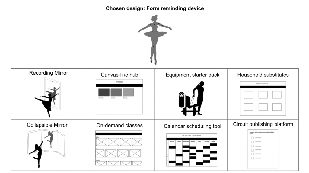 We proposed to Jennifer three potential products designed to address each of the three problems we identified from the initial interview. For Problem 1, we proposed: A. a product to monitor form B. a mirror that can record, save, and play back and C. a hub for dancers to track progress and teachers to review, we imagined it could have an extension that pops up reminders for common mistakes and bad habits that dancers are at risk of developing. For Problem 2, we proposed A. a package of starter equipment that is sufficiently space-efficient and affordable to serve most students at home B. a compilation of acceptable household substitutes that dancers could make and demonstrations of how to use them C. a collapsible mirror for space efficiency. For Problem 3, we proposed A. a hub that aggregates and presents a variety of training options which encourages building a diversified class schedule B. a schedule-building tool which facilitates a customized class schedule C. a circuit writing and storage library for workouts.