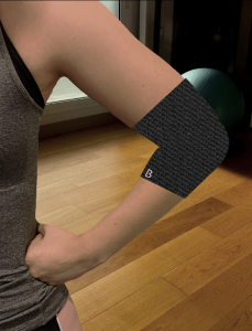Buzz, a wearable compressible sports band with vibration technology designed to give ballet dancers remote form correction feedback during COVID-19 shelter-in-place.