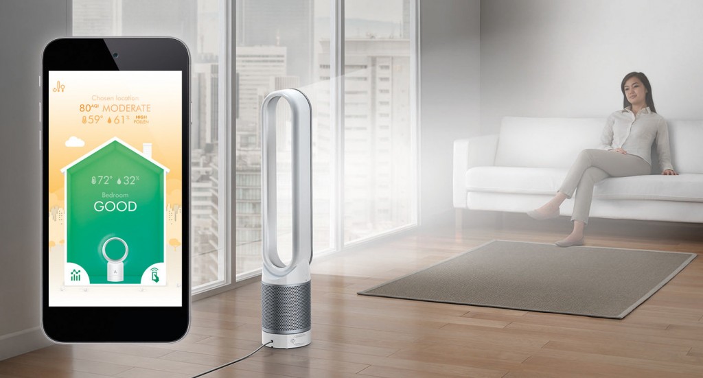 Dyson air purifier with bladeless fan design and companion app that displays real-time air quality data.