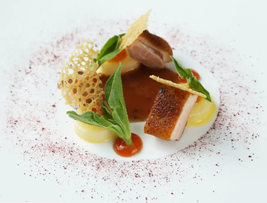 Fine dining plated food that transforms familiar ingredients through artistic presentation, novel combinations, and meticulous attention to detail.