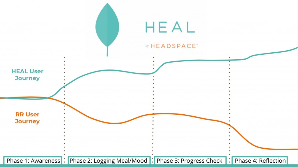 HEAL by Headspace, an eating disorder recovery app concept with personalized characters, swipe-based meal/mood logging, streaks, clinician goal-tracking, and peer buddy features.