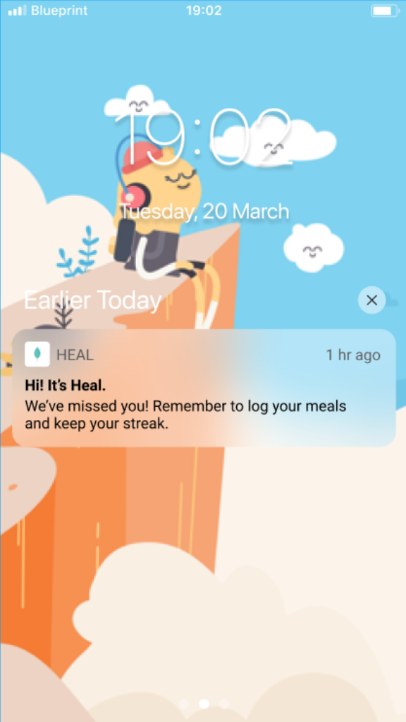 We employ two kinds of notifications. The first assumes low motivation and low ability. Those with EDs may experience a dip in motivation from time to time (i.e. not filling out log routinely). We employed a “Just checking-in, start a streak by logging your next meal” notification for when the user does not log a single meal in a full day. By utilizing a motivational element with this prompt notification, we are using a ‘spark’ prompt. The second one assumes high motivation but low ability. This ‘facilitator’ is a personalized and timed notification that will remind you to fill out your log around your “meal time” and “snack time”.