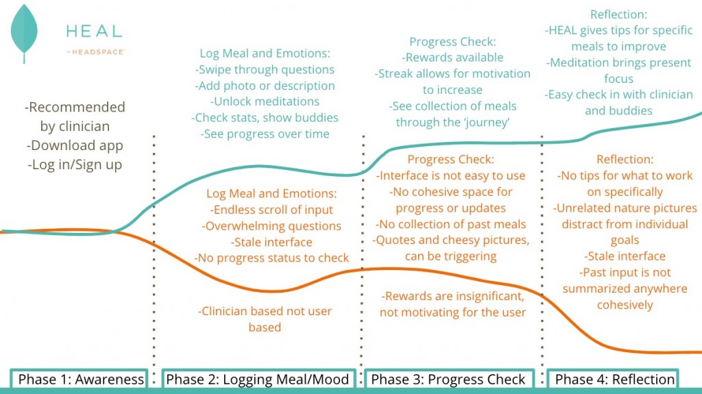 Users are motivated by their own personal experience with EDs and food. Motivation exists because of hope (to heal and recover), pain (mental & physical caused by ED), and fear (of rejection by society). Our journey maps describe the combined motivation and ability users experience from start to finish using RR (old ED app) versus HEAL (new ED app).