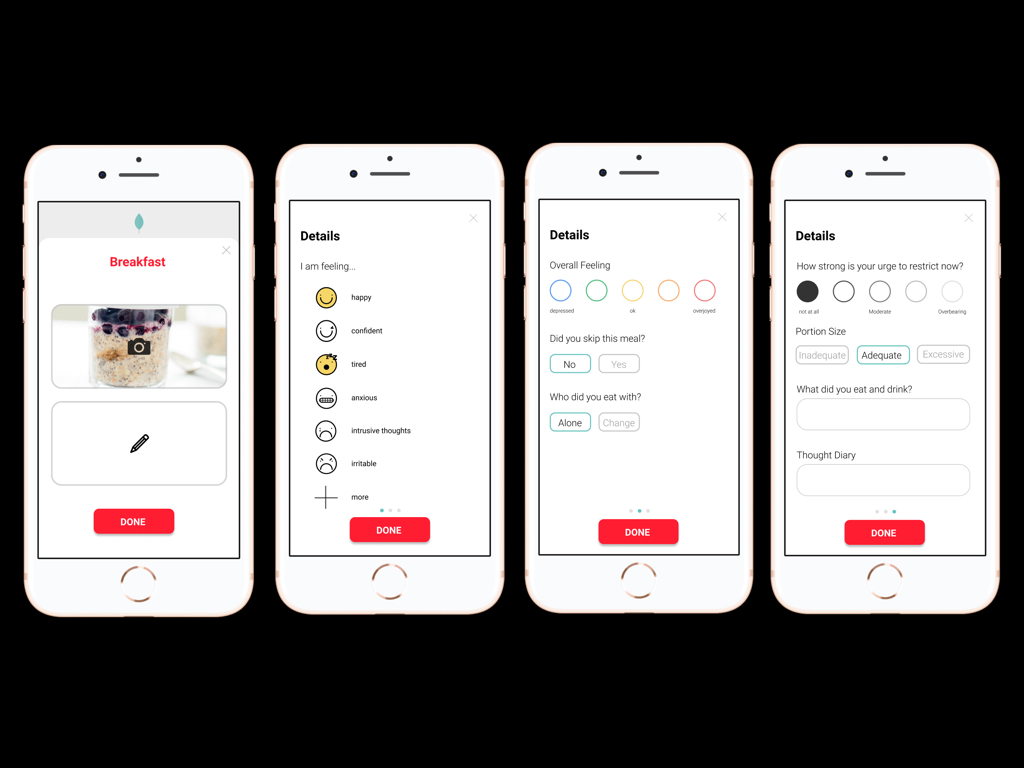 Prior ED apps (such as RR) require you to fill out all of your data (14 questions) related to logging your meal/mood on one page that has a continuous scroll. By employing a swipe feature that divides these 14 questions over 3 pages will decrease the amount of ‘brain cycles’ and ‘effort’ required to self-monitor and capture detail.