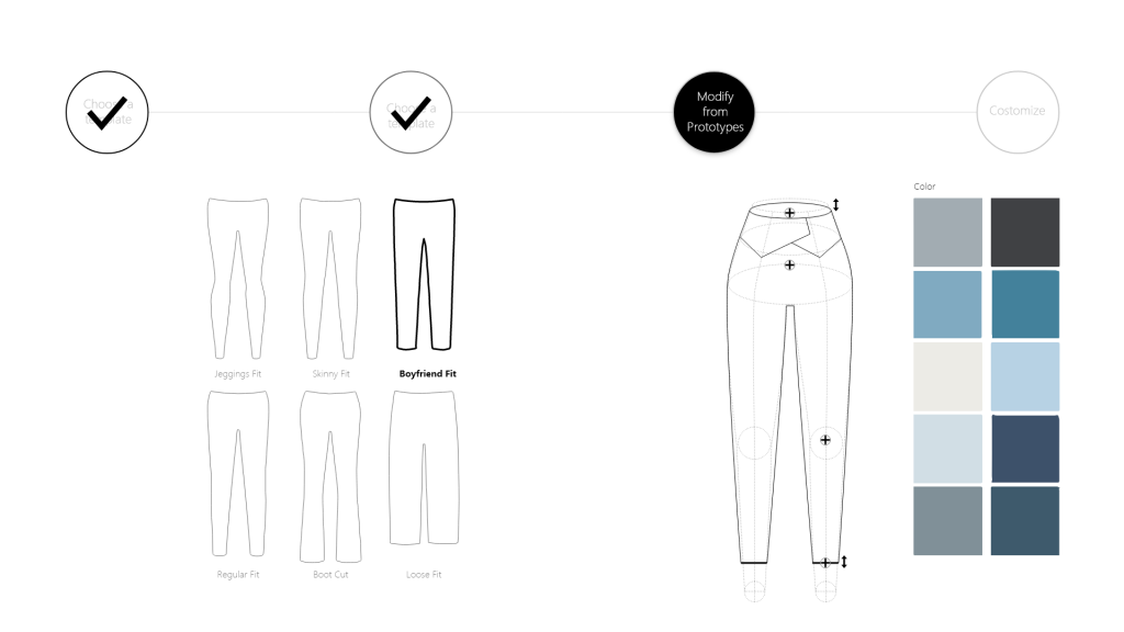 The user customizes the template to their liking. The user chooses the shape of the garment from many standard silhouettes. Everything can be modified, from large structures like the length to little embellished details. They then choose customizations like fastenings (zippers, buttons, ties, etc.) fabric, and color. They may embellish with decorative rips, cuffs, or waistbands. Like popular dress-up apps or creating a bitmoji, the user has complete control over what the product looks like, and they are able to easily select their options.