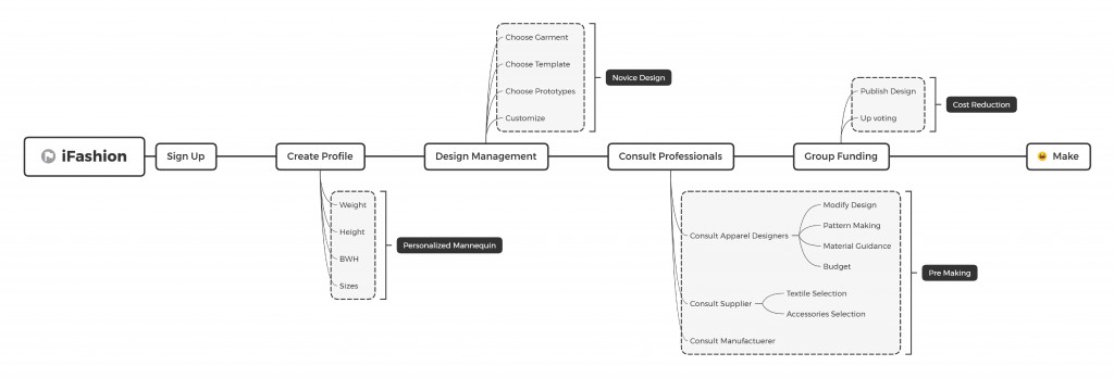 iFashion allows users with little design experience to create their own dream pieces. The app provides access to consult with career fashion designers who will help ensure the feasibility of the piece, dealing with the specifics and structural details. All the user needs is inspiration. If there’s enough interest from other users, the piece could go into real production, facilitated by our marketplace of suppliers and manufacturers. Anyone can have an idea, but now, anyone can design.