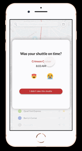 iShuttle is further meant to facilitate physio-pleasure and the behavioral facets of Don Norman’s emotional design. The application features an emoji-based quick feedback form wherein the user indicates whether their shuttle came on time or not. The emoji-based buttons are meant to be engaging for the user, and the selection is designed to gamify the experience. Furthermore, immediately after making their quick selection, the user is thanked with a message explaining that their feedback helps other riders. This reinforcement is both meant to appeal to the user behavioral, and to provide an ideo-pleasure in this message of validation.