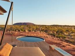 Longitude 131, a luxury hotel in the Australian Outback featuring rooms with hot tubs overlooking Uluru and the vast desert landscape.