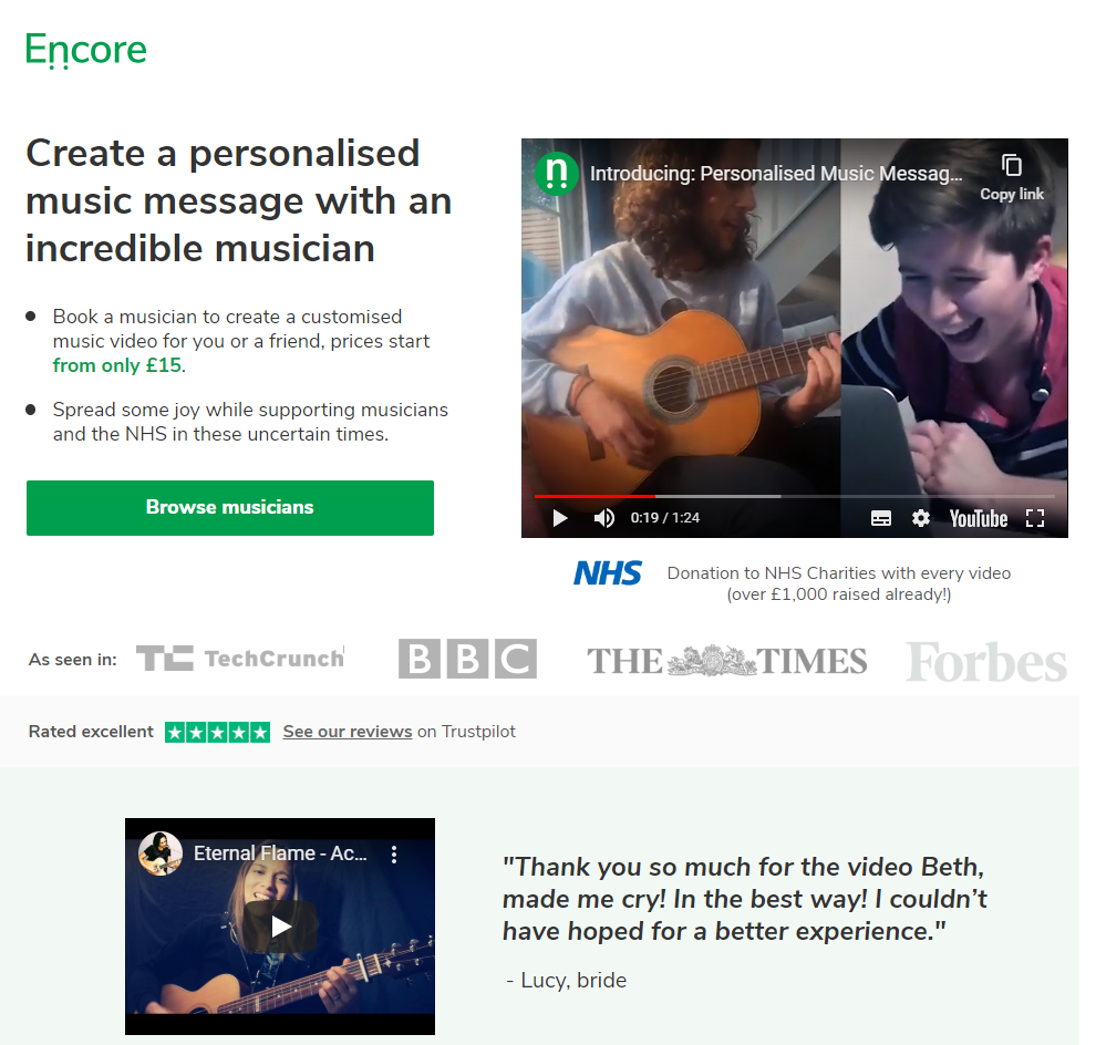 Encore, a platform where users pay musicians to create personalized celebration songs delivered as video recordings, with NHS charity donations.