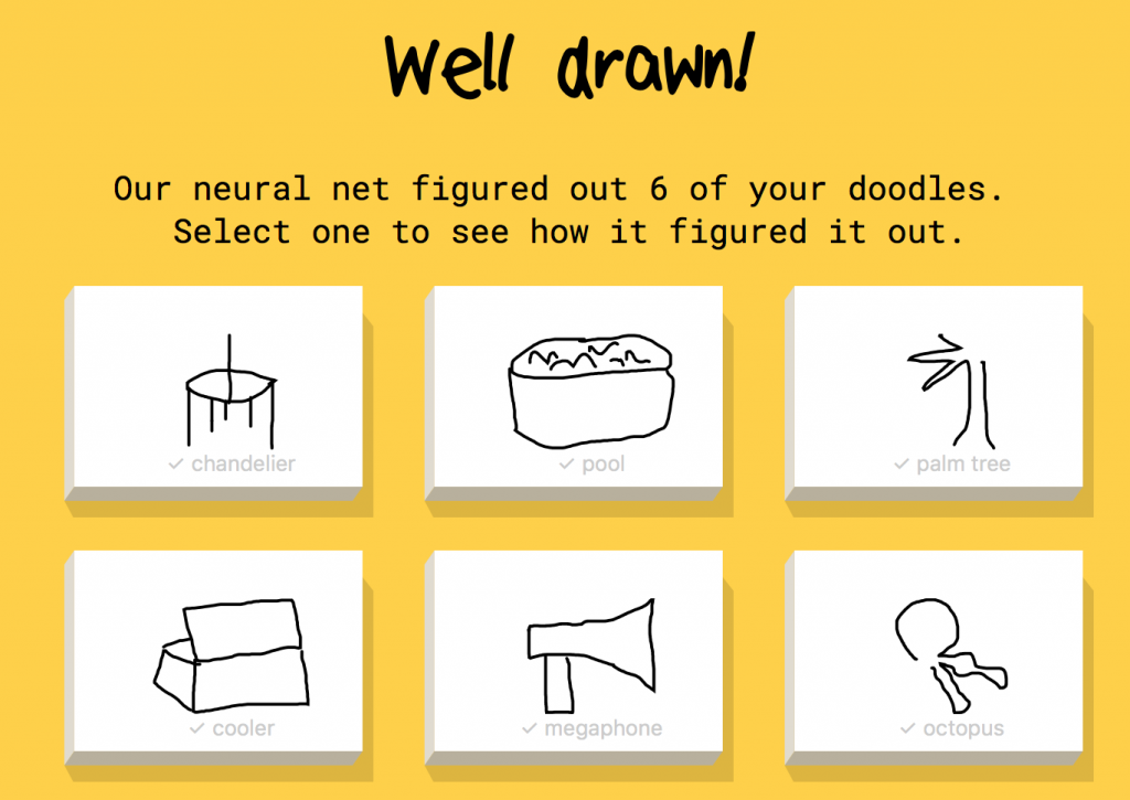 Quick, Draw! is an online game developed by Google that challenges players to draw a picture of an object or idea and then uses a neural network artificial intelligence to guess what the drawings represent. The AI learns from each drawing, increasing its ability to guess correctly in the future. The game is similar to Pictionary in that the player only has a limited time to draw (20 seconds). The concepts that it guesses can be simple, like ‘foot’, or more complicated, like ‘animal migration’.