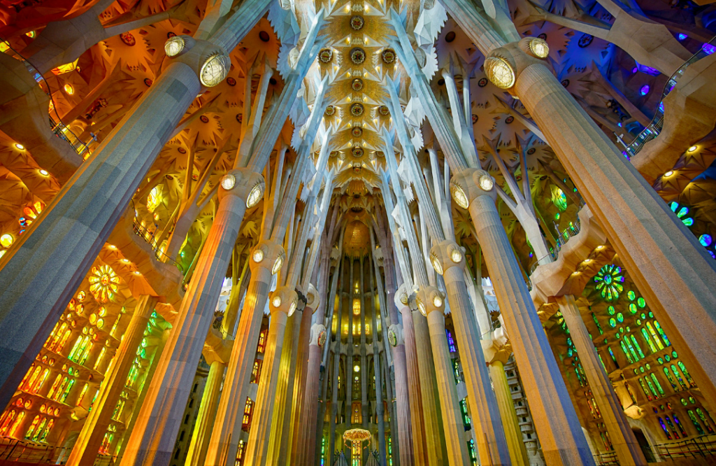 Sagrada Familia basilica in Barcelona, noted for its monumental scale, immersive light effects through stained glass, and surreal interior atmosphere.