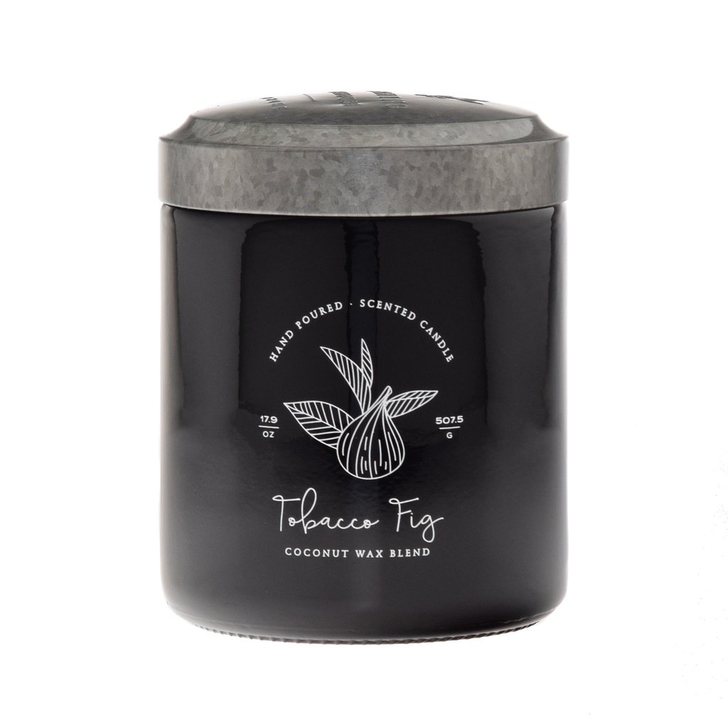 A tobacco fig scented candle in a dark glass jar with coconut wax blend, valued for its soothing aroma and the refined self-image it projects.