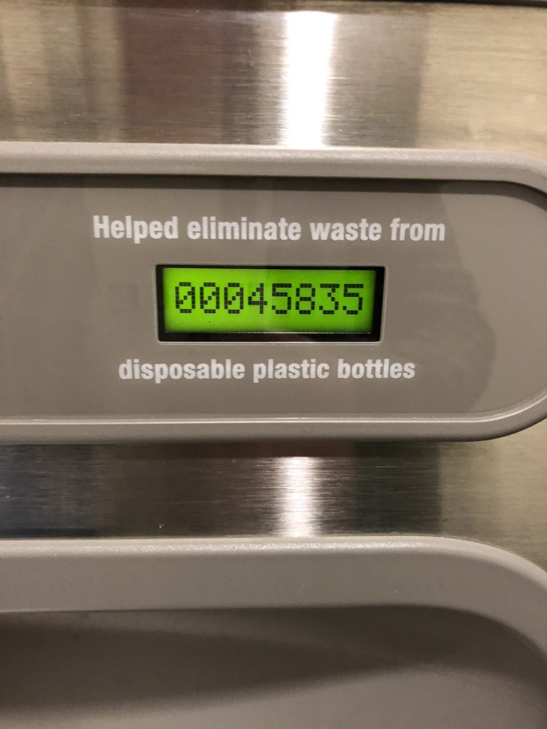Elkay EZH2O water bottle filling station, a public water fountain with a bottle-filling spout and a counter displaying how many disposable bottles have been saved.